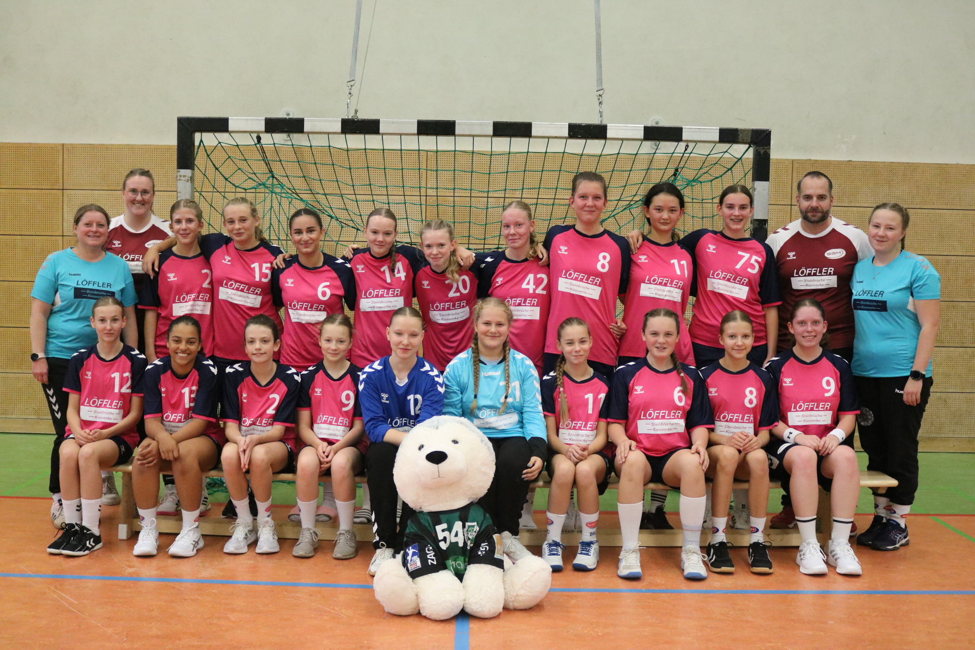 Strahlende Gesichter bei unseren Handball-Mädels: Die weibliche Jugend C und die weibliche Jugend B dürfen sich über einen kompletten neuen Trikotsatz freuen. Möglich gemacht hat dies die großzügige Unterstützung der Firma Löffler Sand- u. Kieswerke GmbH, die den beiden Mannschaften einheitliche, moderne Outfits gesponsert hat.