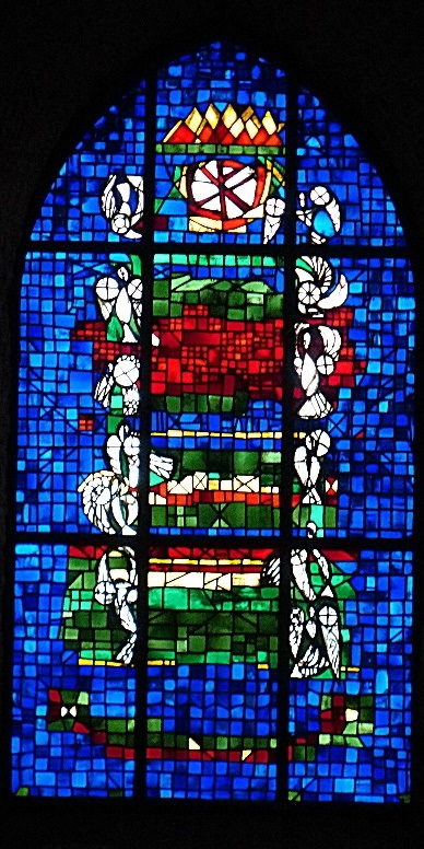 Geht man zum Ausgang sieht man das Glasfenster „Trinität“ als Blickfang in der Turmwand. Es stammt von dem Maler Klaus Arnold und drückt den Gedanken „Vater, Sohn und Heiliger Geist“ in leuchtenden Farben aus.