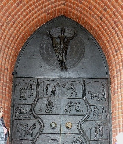 Zum Schluss erläuterte Frau Enke noch das Bronzeportal im Eingang. Geschaffen wurde es 1959 vom Künstler Gerhard Marks der es Discordia – Concordia ( Zwietracht – Eintracht ) nannte. Die beiden Türflügel sind als Relief gestaltet und erzählen von den Gräueltaten des Krieges und dem Gelingen des Lebens unter dem vergebenden und segnenden Christus. Die Stadt Hannover stiftete das Portal zum 600 jährigen Bestehen der Marktkirche.