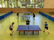 Während die Jugend schon zum gemütlichen Teil, dem Grillen übergegangen ist, gingen um 14 Uhr mit 22 Teilnehmer*innen die Erwachsenen an die Tische, im Spiel um den Titel und begehrten Pokal. Begonnen wurde mit den Doppeln. Hier galt, wer verliert fliegt raus. Klar, dass sich unter diesen Voraussetzungen die Doppelpartner mächtig ins Zeug legten, um in die nächste Runde zu kommen. Ins Finale schafften es dann letztendlich das Doppel Christian B./Kai W. und Victor B./Florian H.